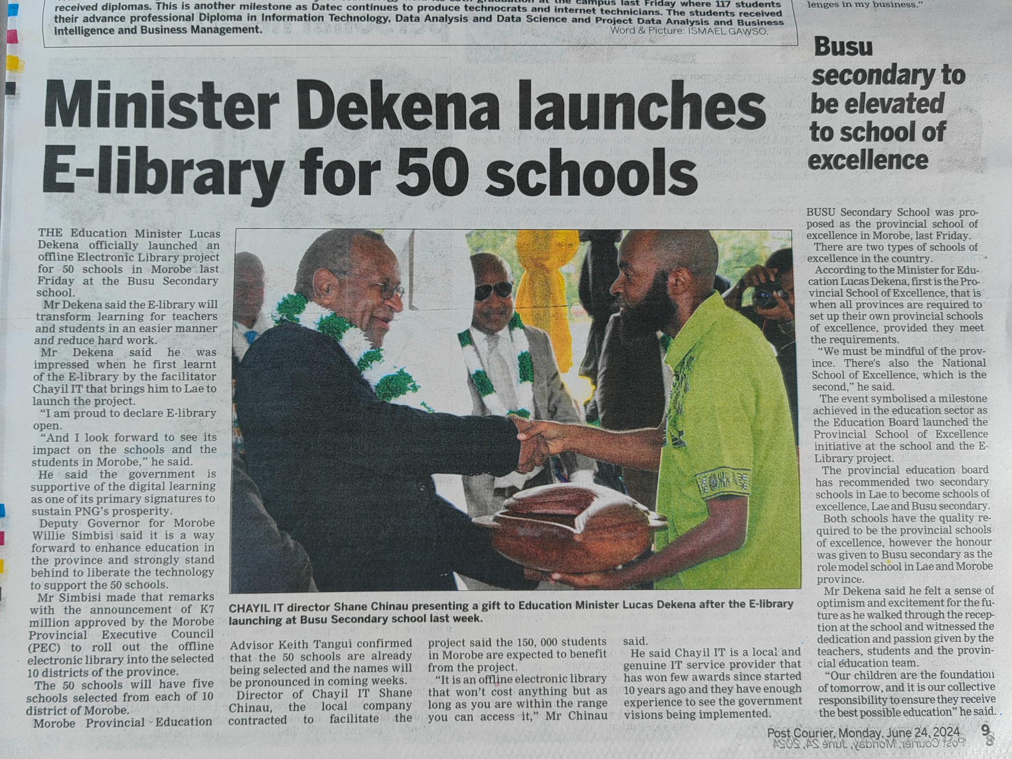 Published: June 2024History was made on June 24, 2024, at Busu Secondary School in Lae, Morobe Province, when the Minister for Education, Hon. Lucas Dekena, alongside the National Education Board, officially launched the Morobe E-Library Project. This historic event marked the start of a K7 million initiative to roll out offline e-libraries to 50 schools across 10 districts, benefiting an estimated 150,000 students and teachers throughout Morobe Province.